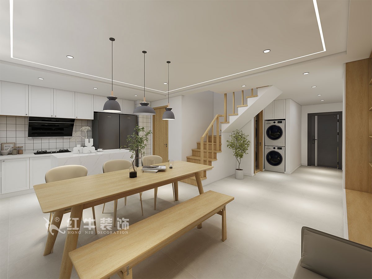 買的學區(qū)房,兩個小孩,一男一女,二樓有窗子的采光只能隔出來兩個臥室,這樣就把兒童房做了一個套間,做了口袋門,晚上睡覺保證兩個臥室的私密性。一樓做成整體空間,餐桌不單單是用餐的桌子,還可以解決孩子做作業(yè),喝茶等問題。