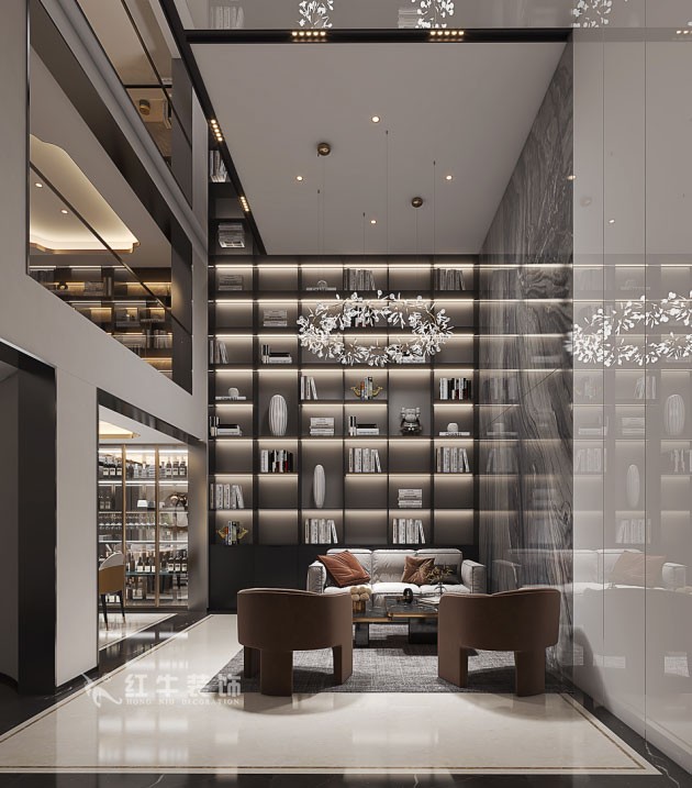在會客廳設計上,挑高設計,采用深色柜體、大理石墻面,豪華吊燈配上局部玻璃頂,整個空間高大氣派極具現(xiàn)代感。