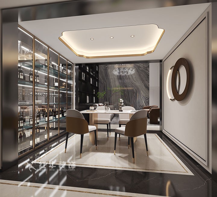 在品酒區(qū)設計上,深色木飾面,玻璃酒柜與頂面金屬線條相呼應,奢華感十足,與會客區(qū)空間融為一體,相互映襯。
