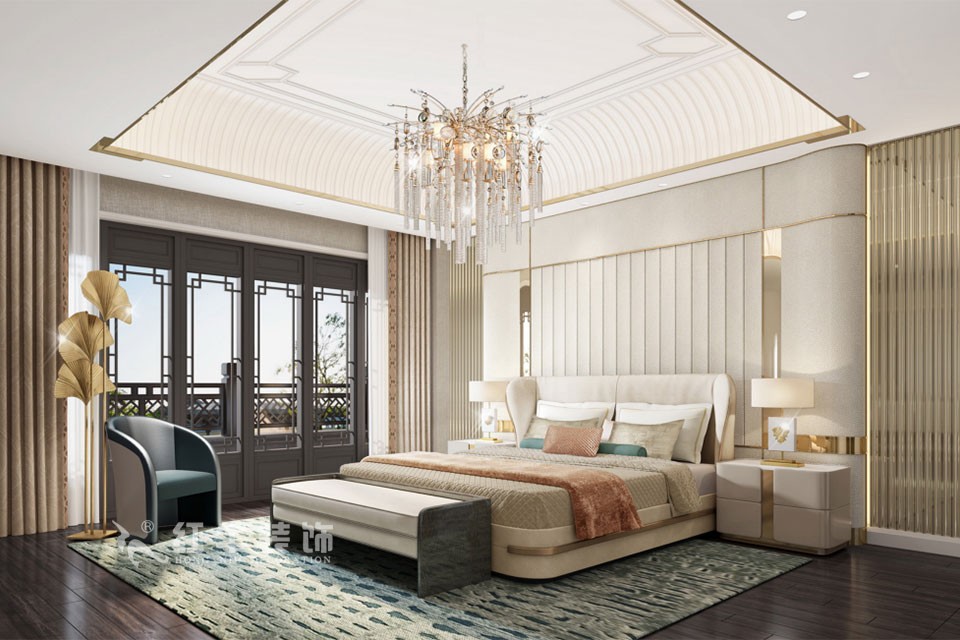 在主臥設計上,背景選用法紋玻璃、皮革、銅鏡極具視覺沖擊力,挑高吊頂搭配配上豪華吊燈整個空間奢華大氣。