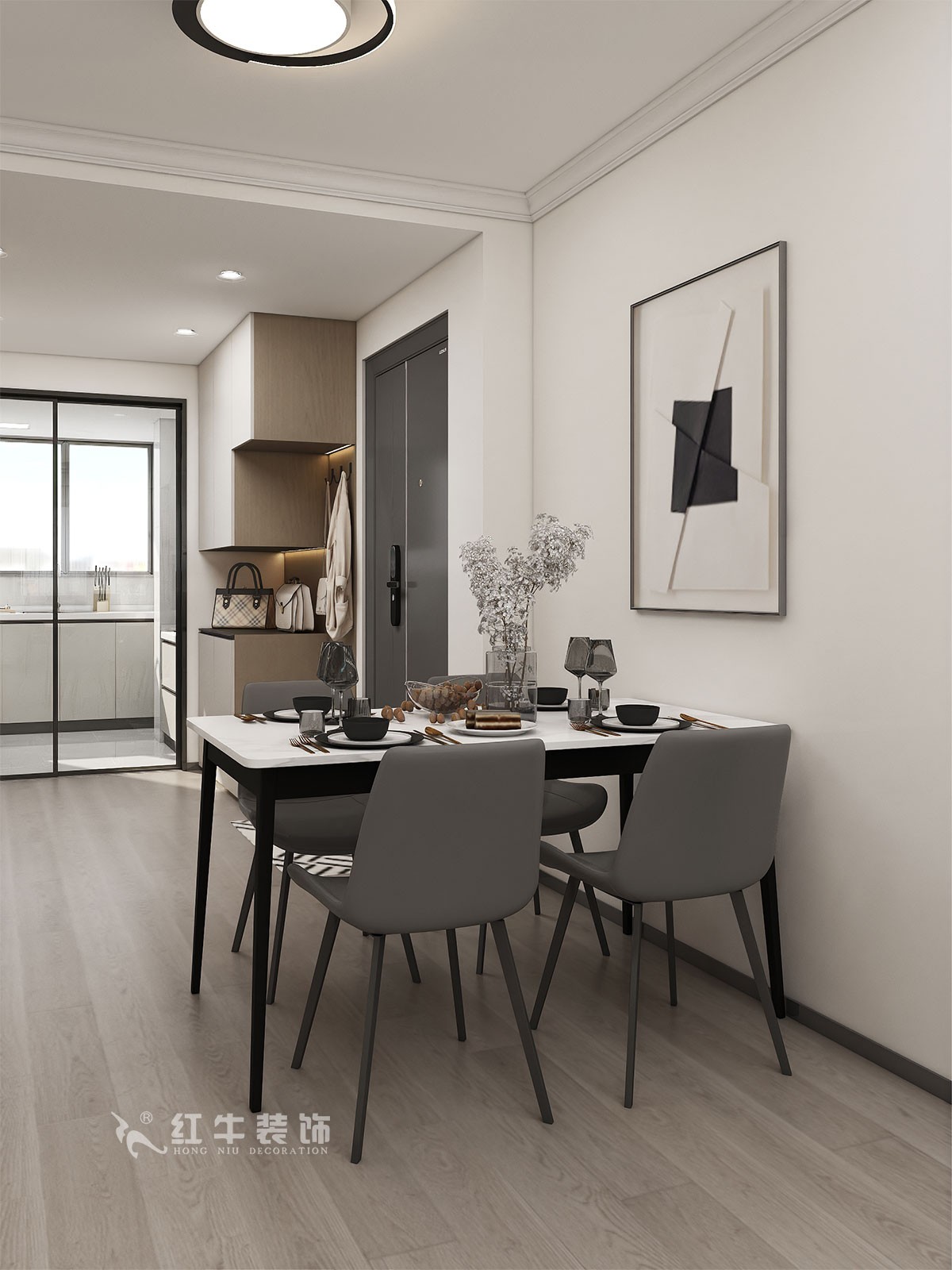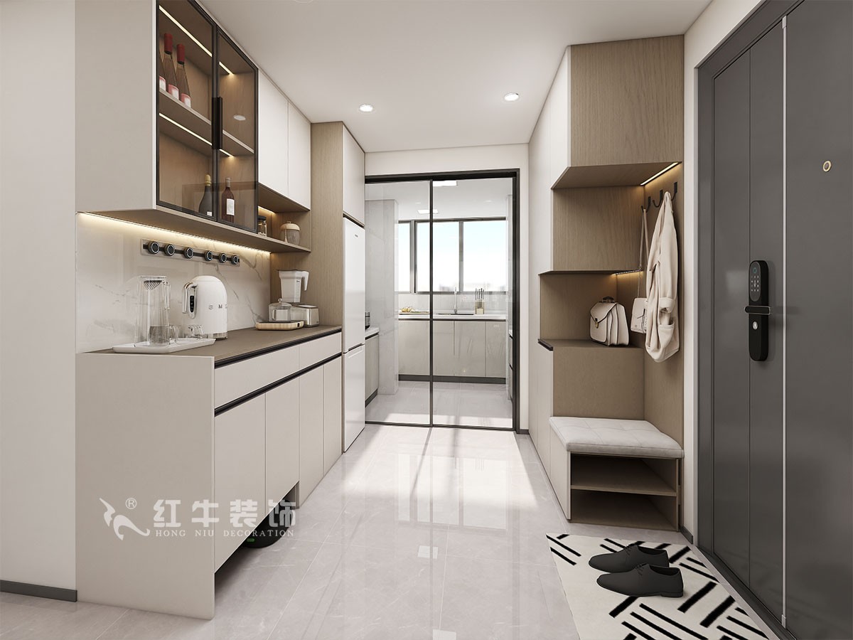 房子規(guī)整,沒有太多需要調(diào)整的結(jié)構(gòu)。衛(wèi)生間的門方向的調(diào)整,增加了衛(wèi)生間功能的利用率。進(jìn)門餐邊柜,鞋柜,功能齊全。
