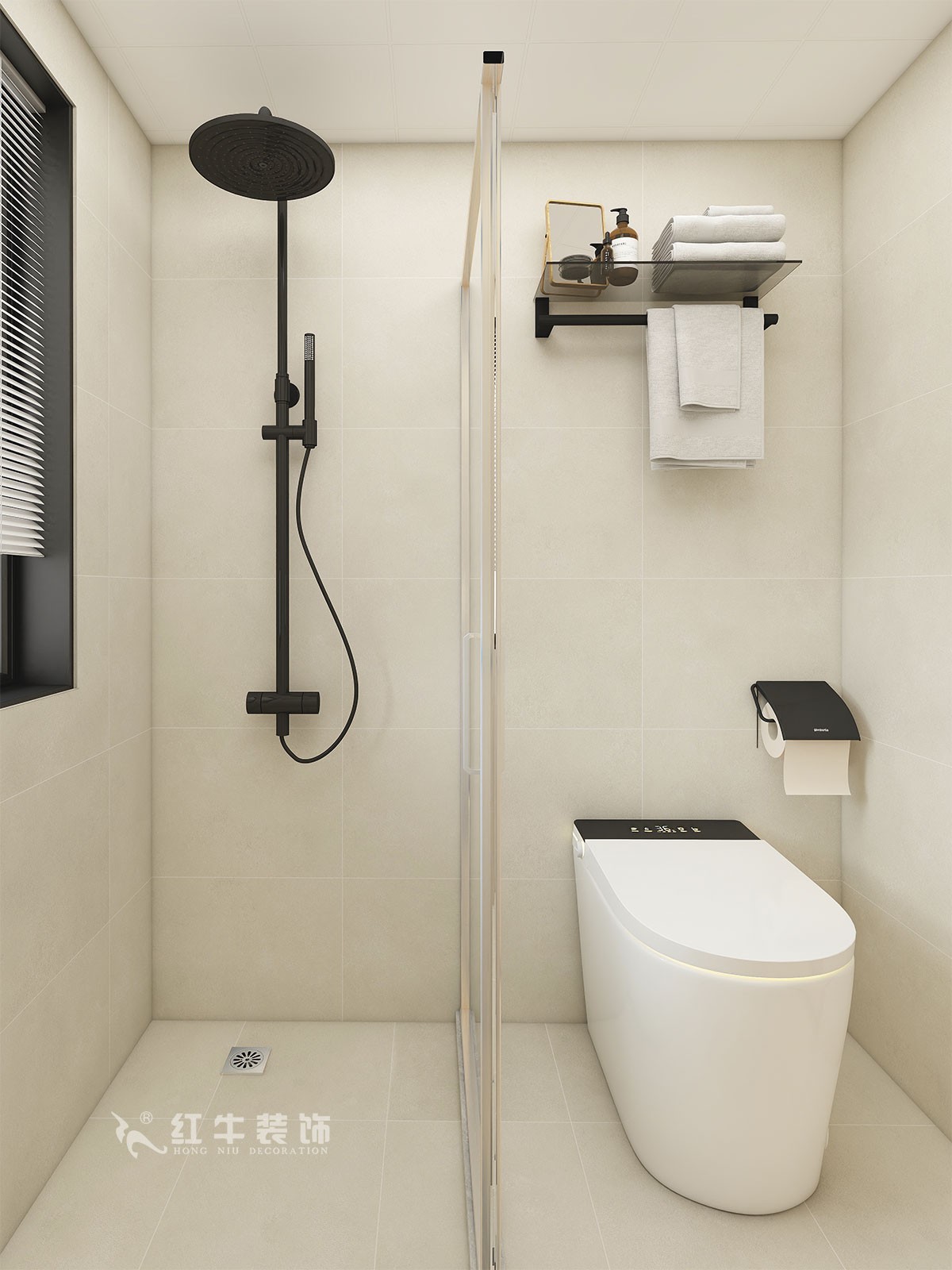 衛(wèi)生間說明:整體色彩搭配干凈、大方,選擇大尺寸淺灰色瓷磚上墻,氛圍感溫馨感滿滿。