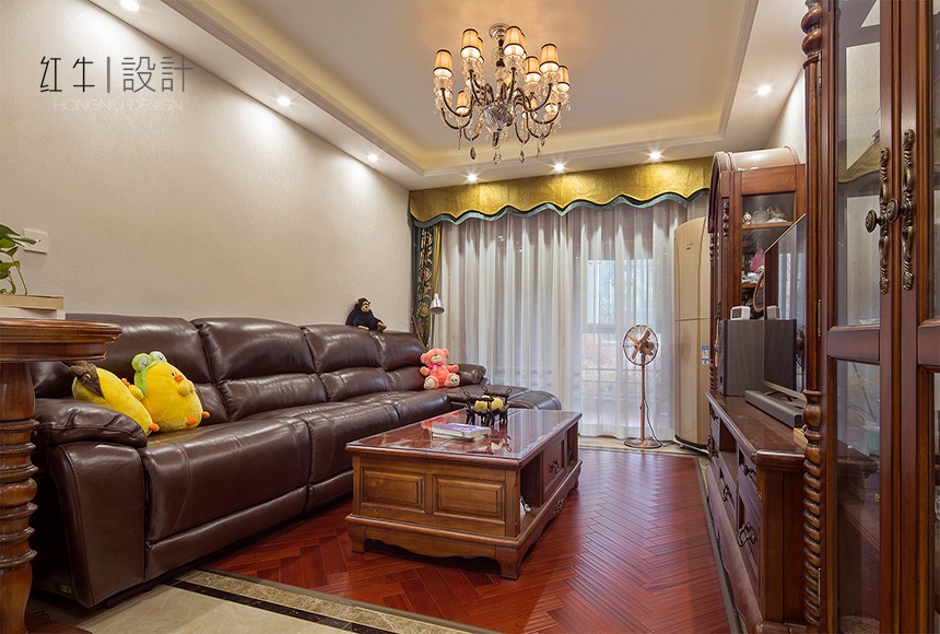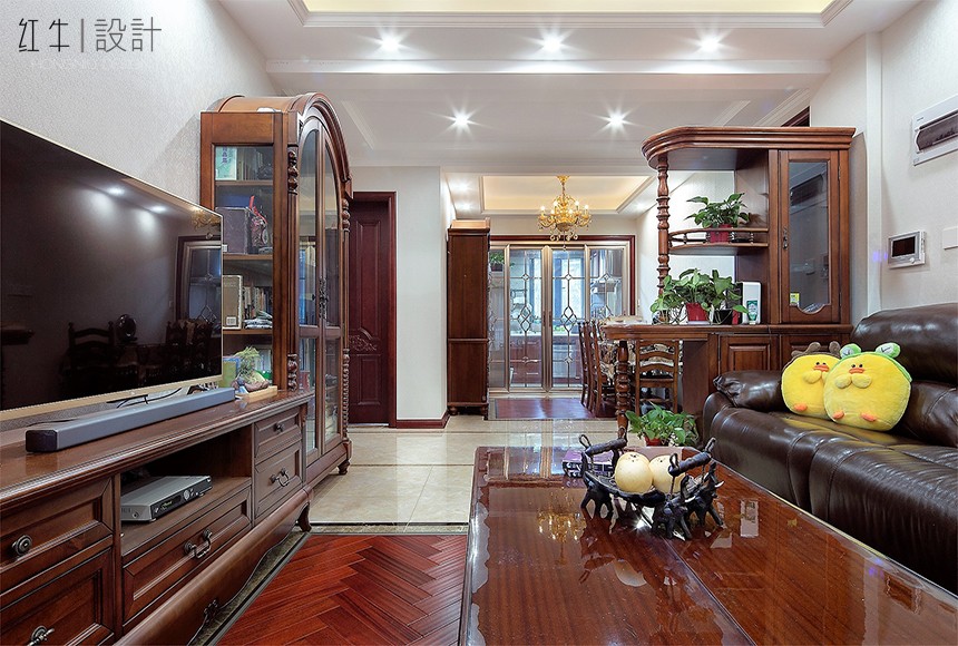 3.方案整體以深色家具為主,整體以小美式為主。后期用軟裝,家具整體搭配,制造出了一個舒適溫馨的小家。
