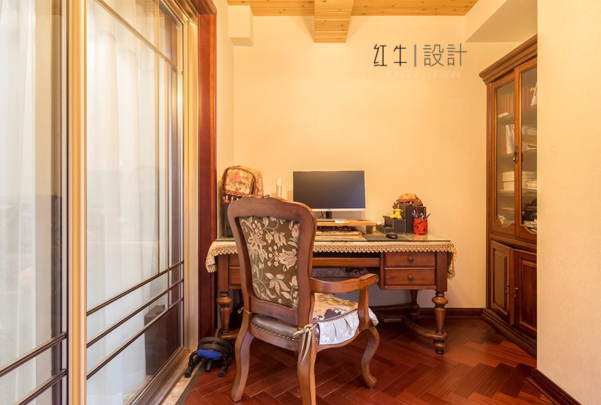2.業(yè)主平時需要看書,需要一個獨立的書房,所以利用了客廳陽臺的區(qū)域,改成了一個書房,同時也增加了儲物空間。