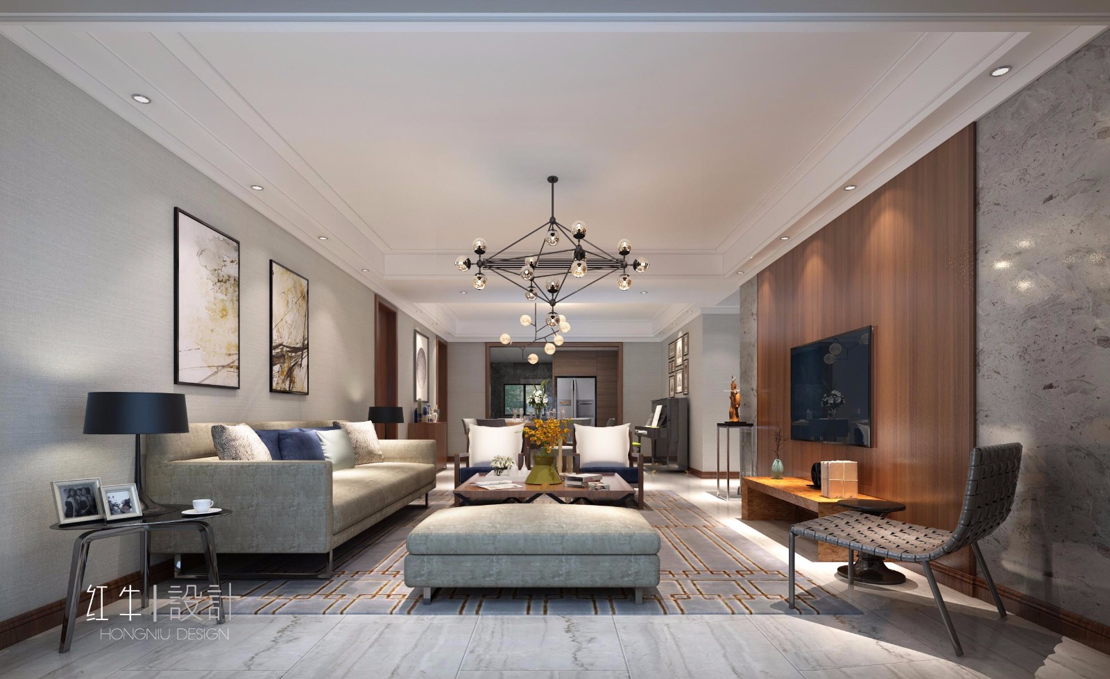 本案設(shè)計的整體風(fēng)格定位為現(xiàn)代簡約。圍繞著獨樹一幟的設(shè)計感和溫馨來考慮。對材質(zhì)整體色系采用白色,米褐色,淺灰等。業(yè)主是藝術(shù)從事者,主臥選擇了新中式的風(fēng)格效果。在布局上廚房選擇了開放式廚房。以整體明亮的光源,充分照明,配以點綴性的輔助光源,打造有品位且溫馨的家居生活環(huán)境。