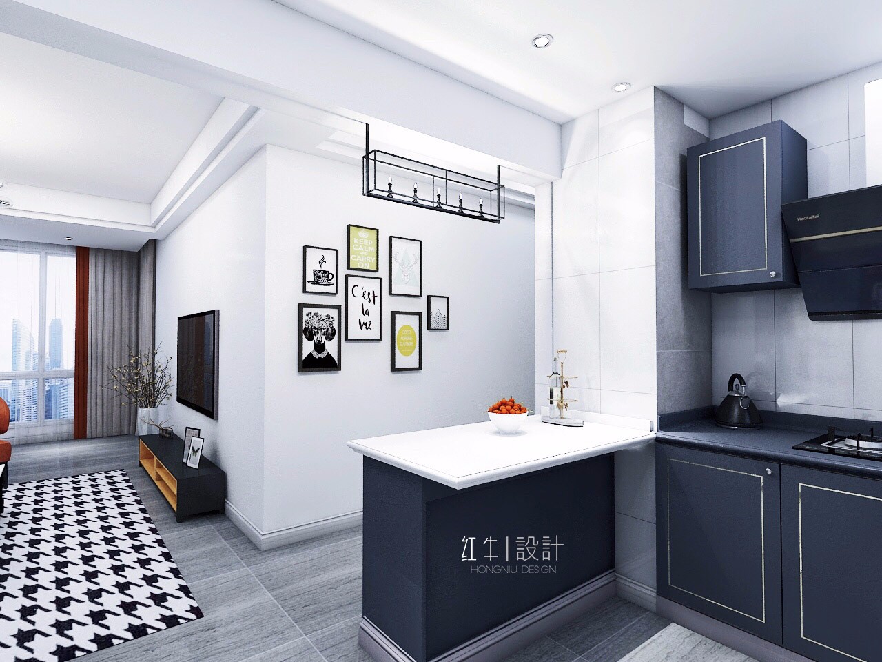 黑白兩色組成的地毯十分顯眼,構成客廳的主要色調,簡潔但不失品味,顯得很上檔次。