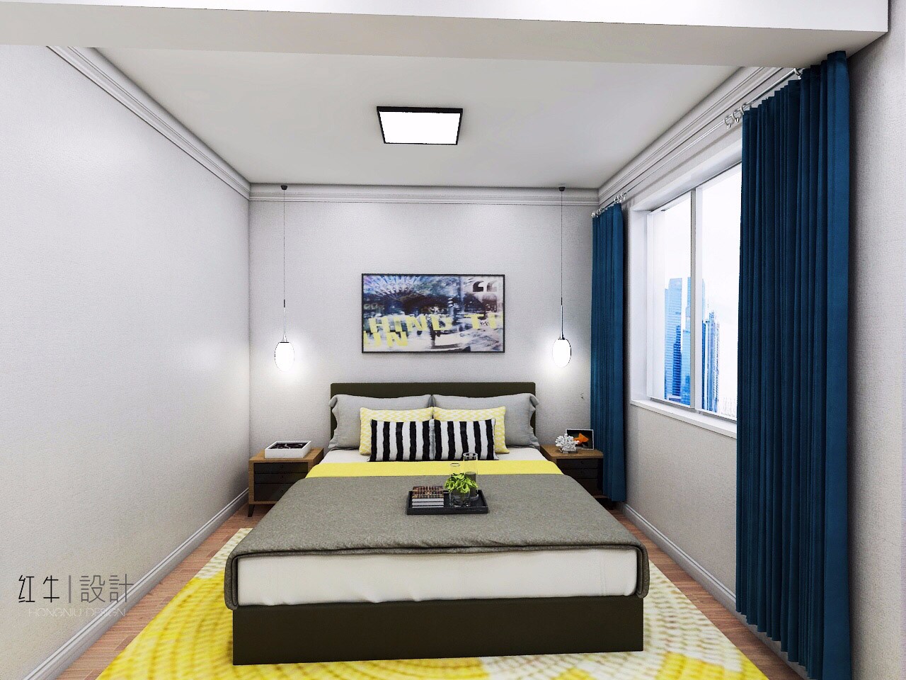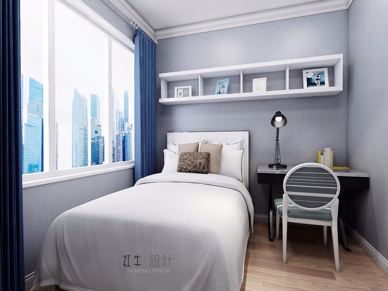 次臥面積比較小,但是大氣的灰色墻壁,搭配白色的床上用品,簡潔大方,很是舒適。