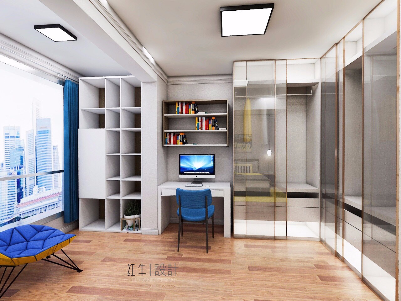 然后就是衣柜部分,柜門是有色玻璃,玻璃質感通透,給人一種精致的感覺,效果很是驚艷。還留了一小塊地方放了張書桌,平時可以在此辦公。