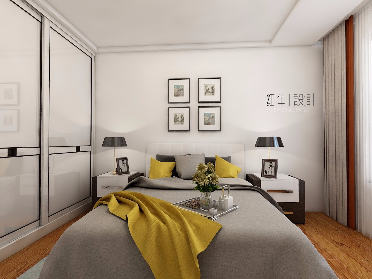 鮮亮的黃色床旗與枕頭的搭配,使人感受到了強(qiáng)烈的視覺(jué)沖擊感,整個(gè)空間都被點(diǎn)亮了。