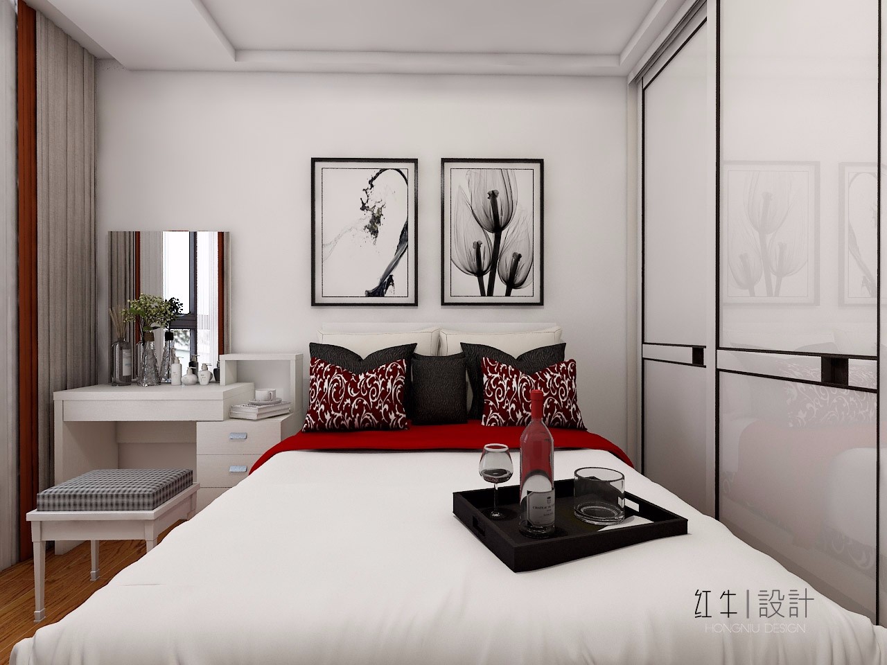 臥室本來(lái)是淺色系,但是床品的紅色與花紋讓人在簡(jiǎn)約淡雅中又感受到一份絢麗之美。