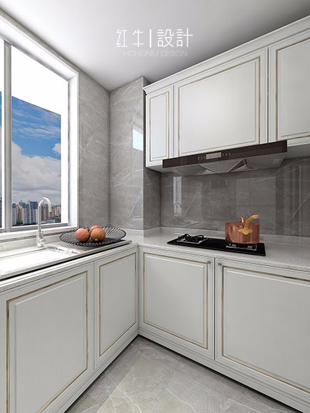 廚房以白色為基調(diào),給人一種清潔感,加上灰色的墻磚,顯得更加時(shí)髦。