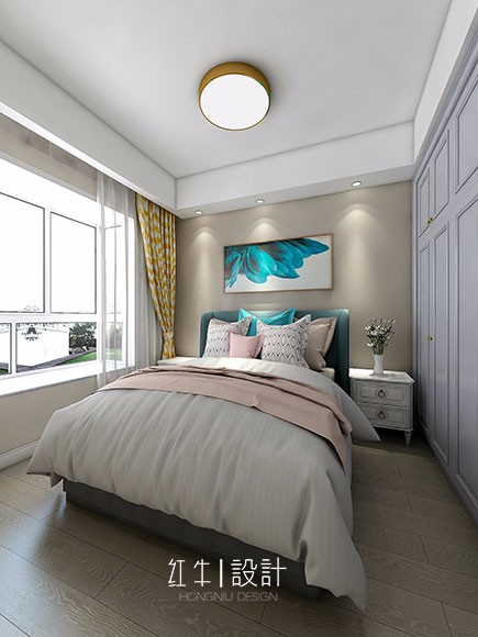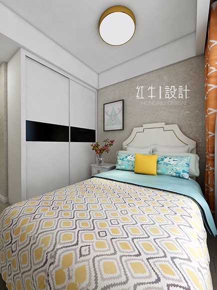 臥室整體空間清新明快,黃色窗簾給人以活潑的視覺感受。