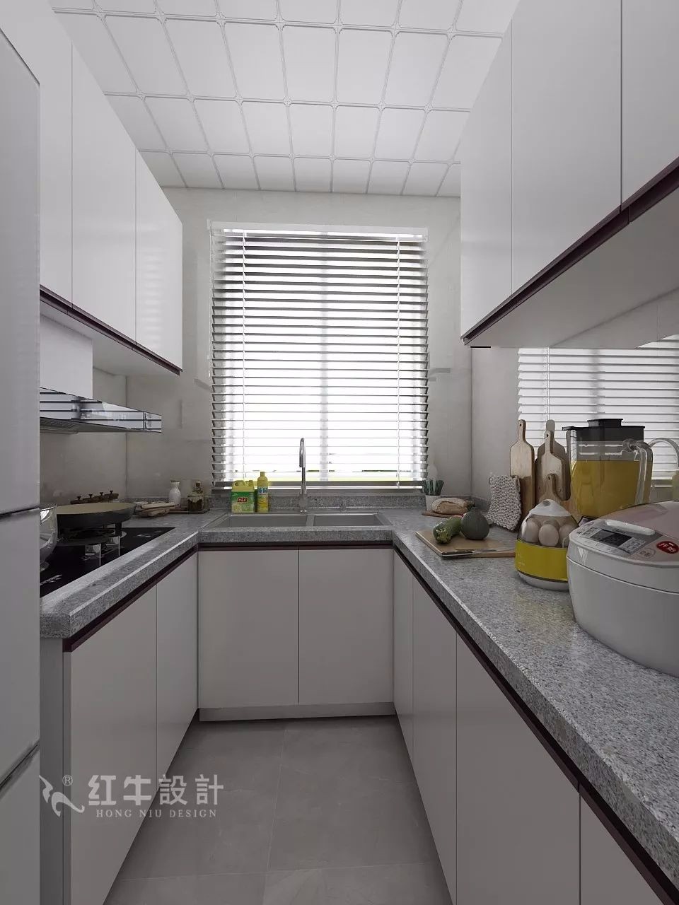 緊湊的U型廚房,存儲空間充足,烹調(diào)操作便利,全白的烤瓷面櫥柜讓廚房顯得清爽大方。
