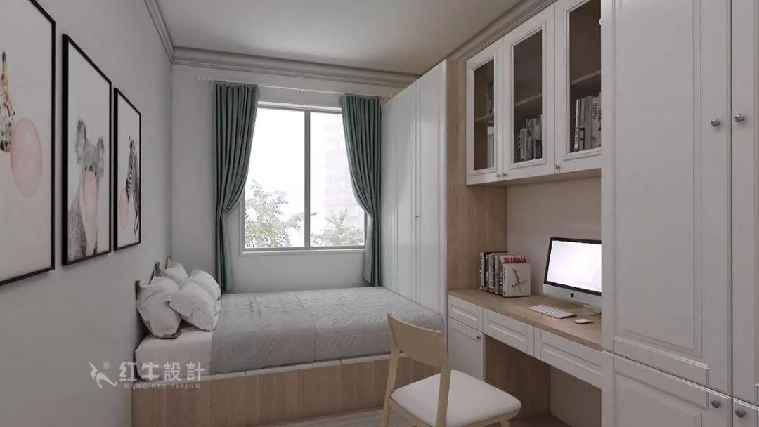 次臥設(shè)計(jì)成榻榻米房,將睡眠空間、閱讀空間和收納空間結(jié)合起來,木色的整體柜體搭配白色的歐式面板讓空間顯得簡潔舒適。