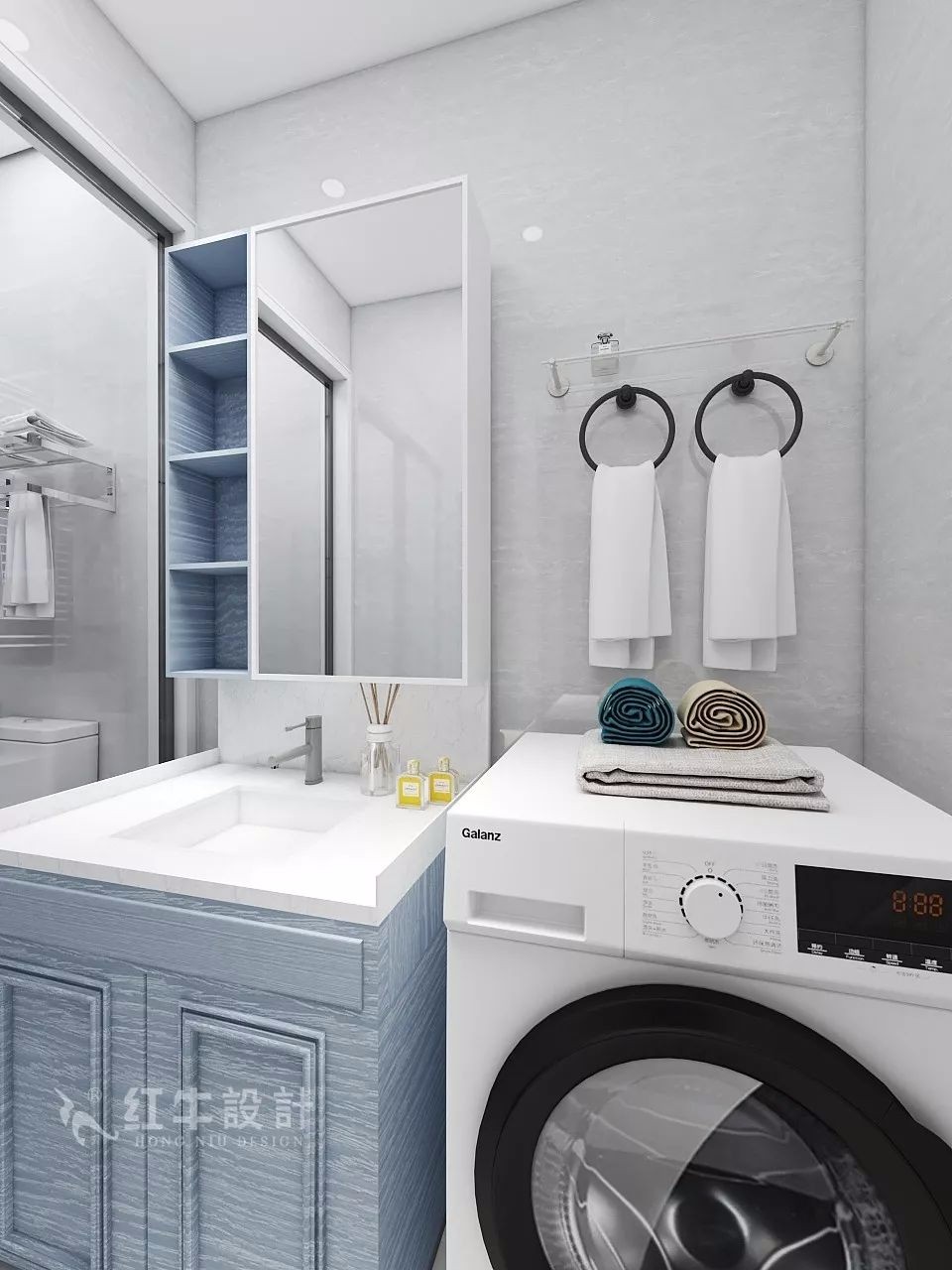 淋浴區(qū)與馬桶區(qū)之間、馬桶區(qū)與洗漱區(qū)之間,都使用透明的玻璃材質(zhì)進(jìn)行隔斷,不影響采光,而且干濕分離非常徹底。