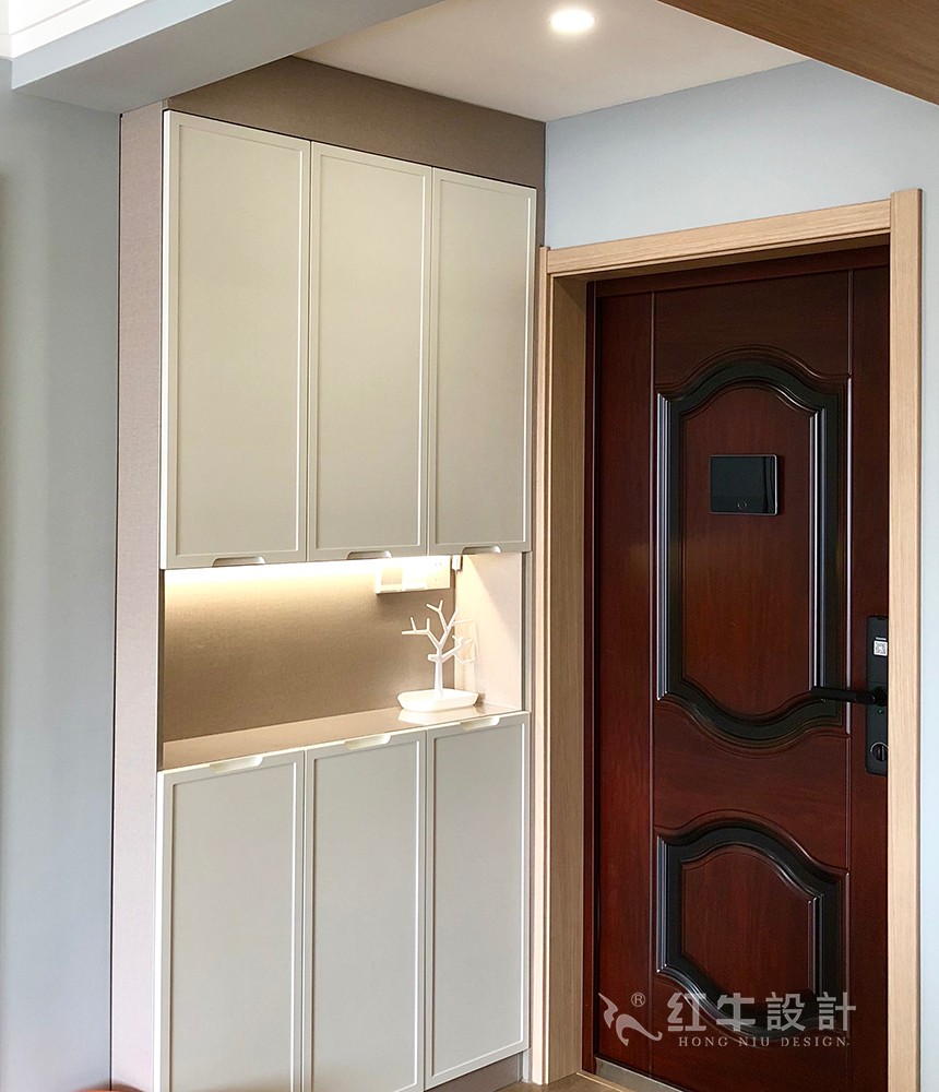 利用進(jìn)門(mén)右手邊的墻體空間做了一個(gè)整體柜,開(kāi)放與封閉式組合的設(shè)計(jì),配合燈具與裝飾品,打造出輕松舒適的玄關(guān)空間。