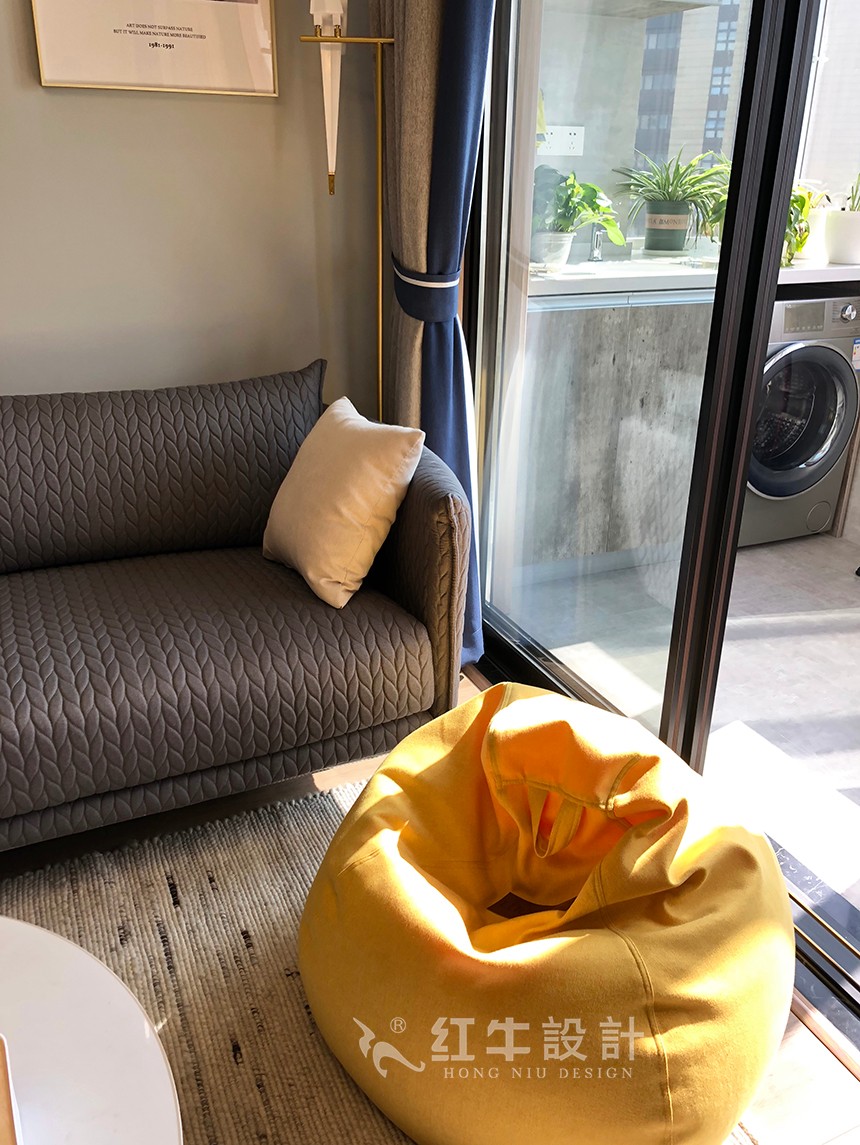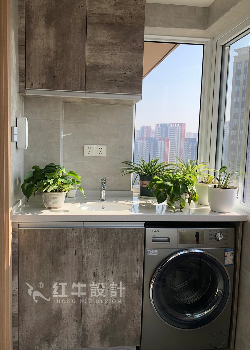 陽(yáng)臺(tái)與客廳之間采用玻璃推拉門(mén)隔開(kāi)。陽(yáng)臺(tái)設(shè)計(jì)了洗衣臺(tái),美觀又實(shí)用,柜面的水泥灰具有天然感和穩(wěn)定的魅力,帶來(lái)一種自然質(zhì)樸的空間感受。