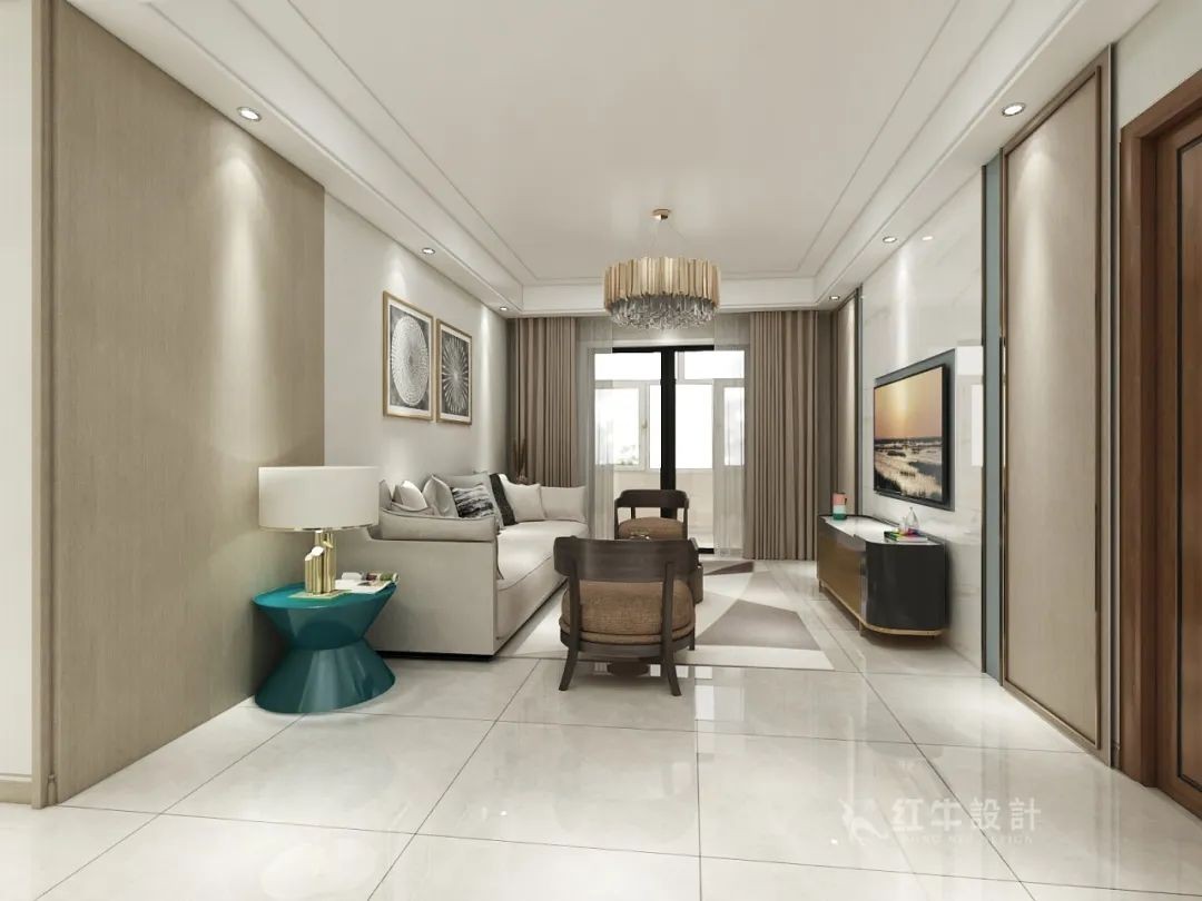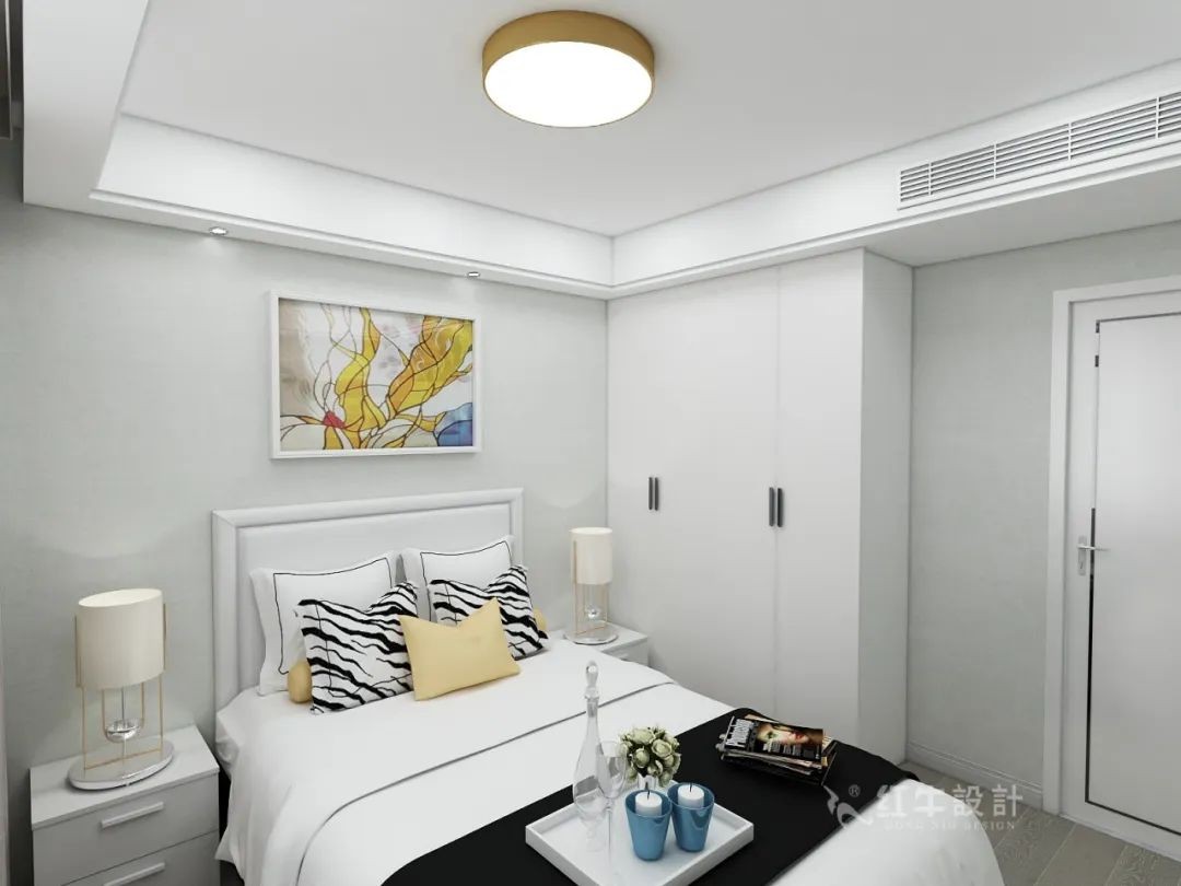 次臥的門開在電視背景墻上,可以通過隱形門與護墻板對稱的做法,讓電視背景墻變得更完整,臥室的隱私性也更好。