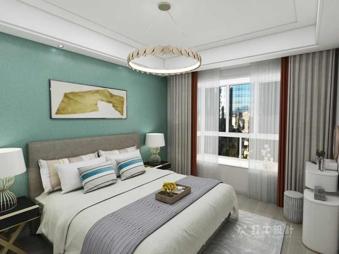 臥室背景墻用蒂芙尼藍做跳色,帶給臥室與浪漫與溫馨的情調。窗簾灰色與彩色的豎拼,使得室內(nèi)色彩更加豐富。