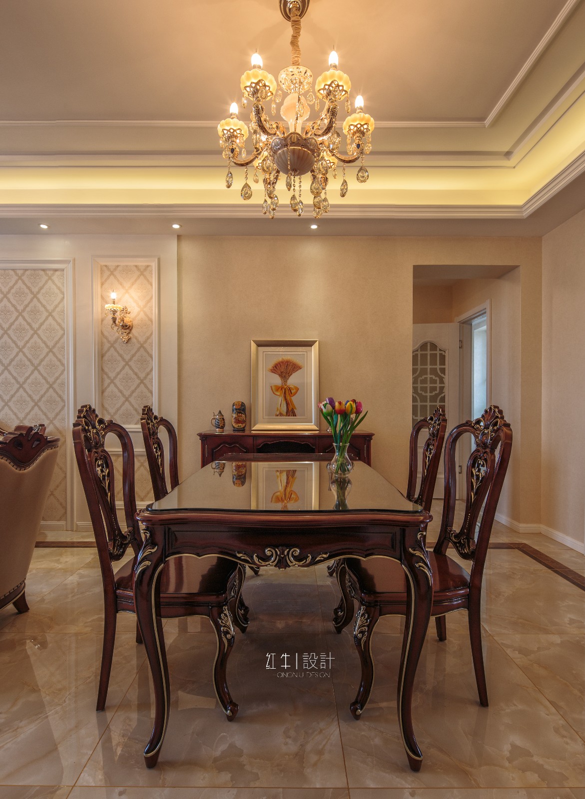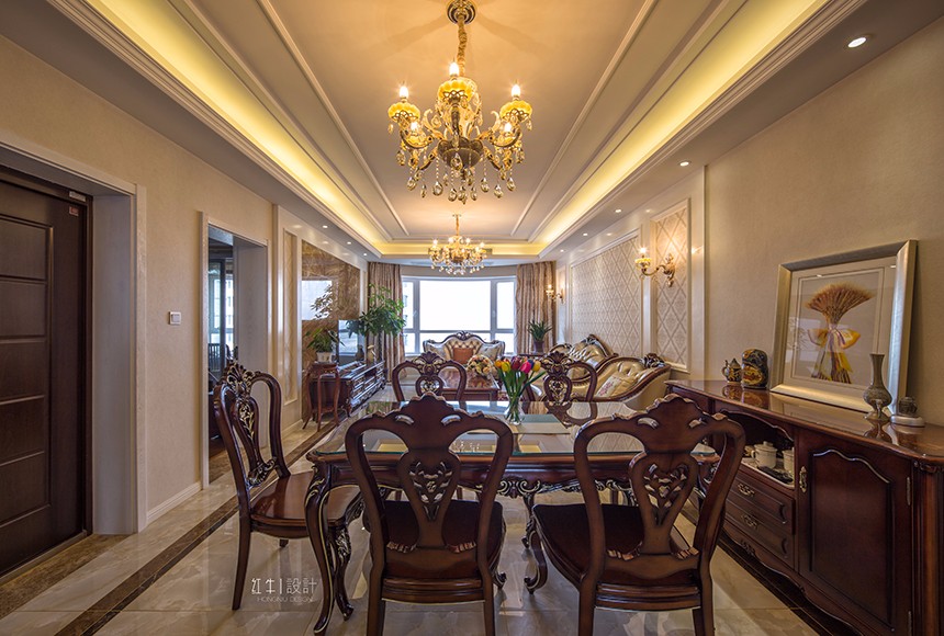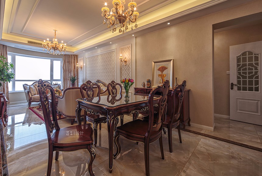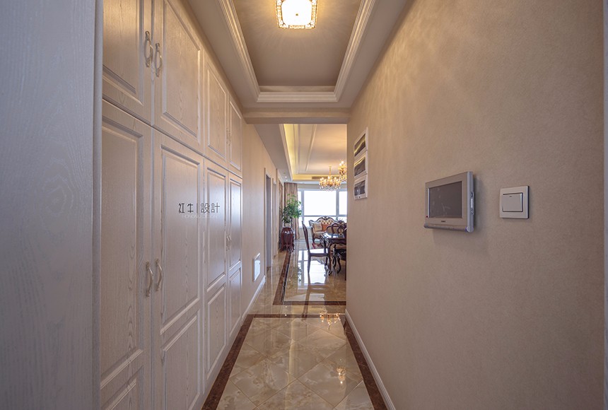 分享和交流是本案的精髓。初次溝通,此案是祖孫三代同住,業(yè)主為中年人,經常去歐洲國家出差,對歐洲文化獨有情鐘,所以此案有效的利用空間、并用簡約明快的造型及色彩以突顯空間及功能的延續(xù)性,并融合歐式的裝飾元素及裝飾色彩。設計中的造型呼應的技巧,頂面造型和地面材質造型的相互呼應,沙發(fā)背景和電視背景造型的相互呼應,門廳造景和餐廳造景的相互呼應,運用多組呼應的設計技巧,像作文章的排比句,把整個空間貫穿起來,使得氛圍更加濃烈,整體性更加統(tǒng)一。打造出一個共享、時尚、典雅的居住空間。
