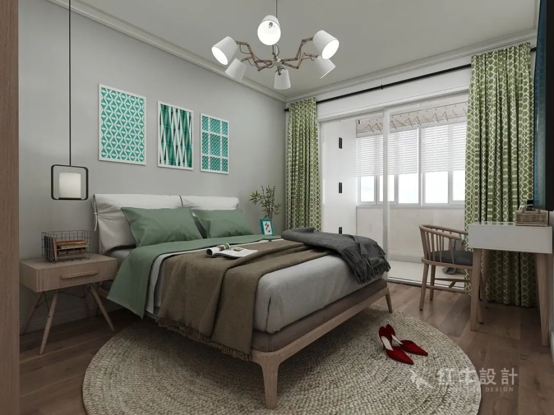 臥室的背景選擇了灰色調(diào),體現(xiàn)了主人沉穩(wěn)內(nèi)斂的個(gè)性,綠色窗簾和木色衣柜顯得活潑,讓空間更加協(xié)調(diào)舒適。