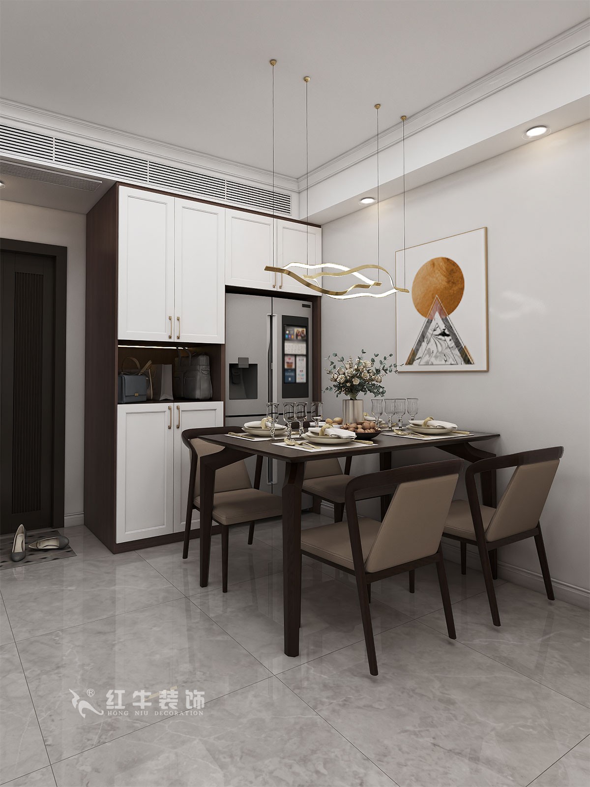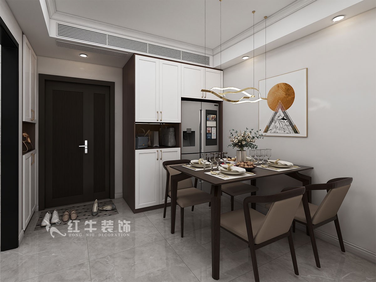 入戶門廳開間增加餐邊柜,與冰箱齊平,即增強(qiáng)廚房空間,又提升空間儲(chǔ)藏。
