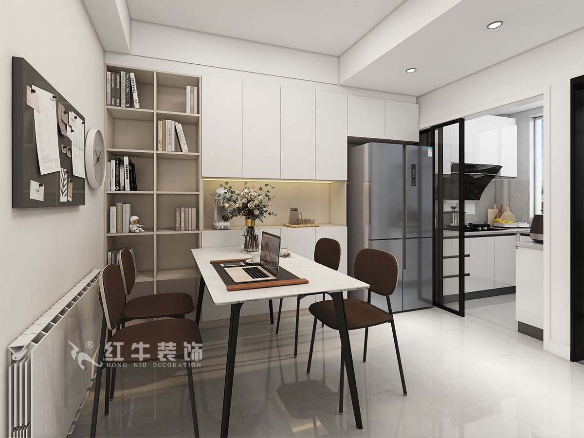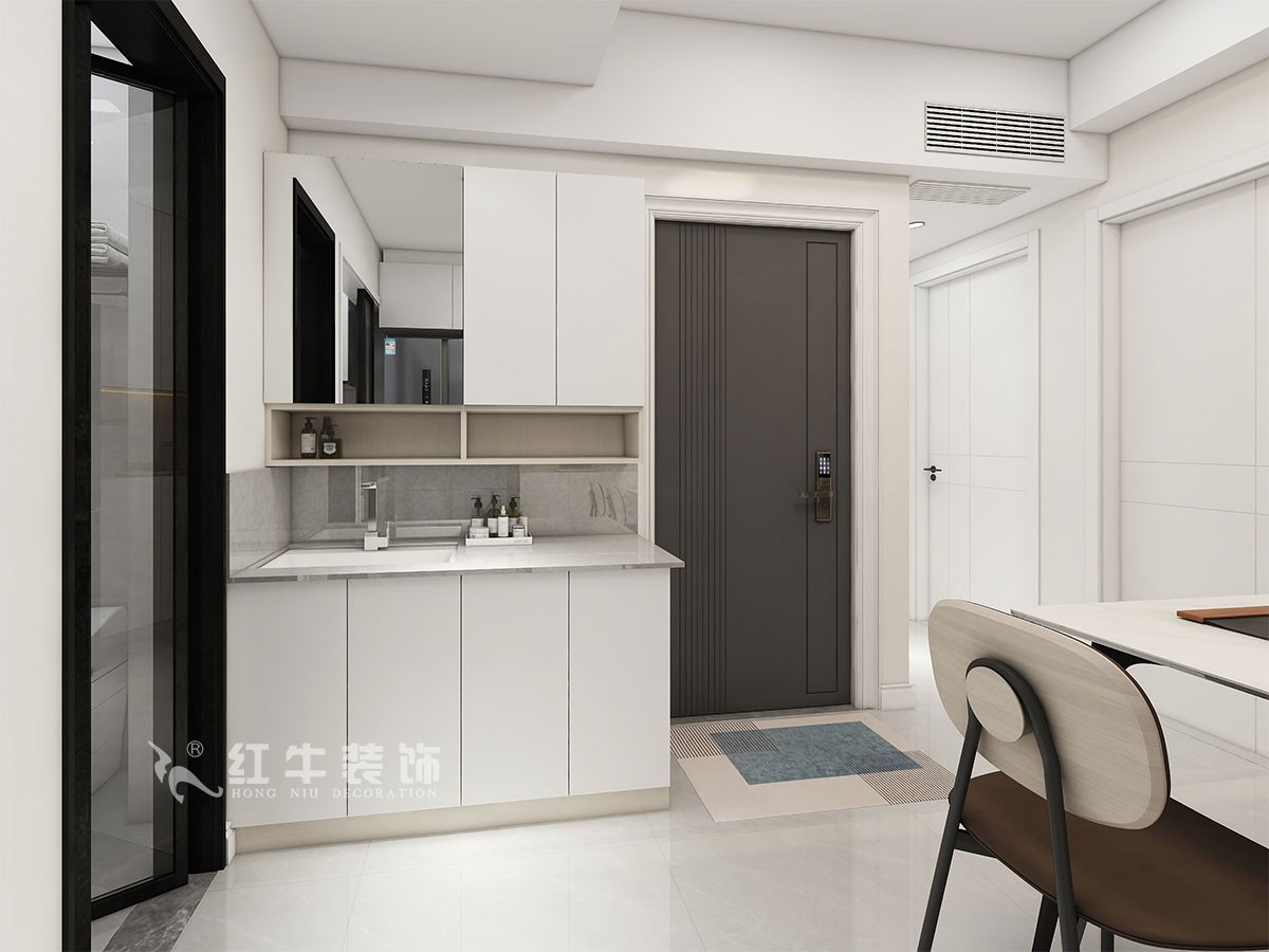 本案為城市中心學區(qū)房,一家三口居住,小朋友即將成為小學生,業(yè)主夫妻倆平時工作比較忙,經(jīng)溝通客廳只保留就餐兼顧辦公學習的空間。因廚房面積偏小,冰箱我們安排到了餐廳,衛(wèi)生間洗漱臺盆柜,也和進戶鞋柜結(jié)合設計。兩個臥室的面積比較大,我們在基礎的衣柜儲物上,又增加了其他儲物柜。